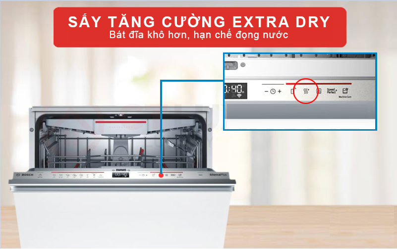 Lựa chọn Extra Dry, máy sẽ sử dụng nhiệt độ cao ở lần tráng cuối và tăng thời gian sấy. Vì thế nước trên bề mặt bát đĩa sẽ bay hơi khi nhiệt độ cao. Kết hợp cùng nước làm bóng sẽ giúp bát đĩa bền đẹp hơn sau mỗi lần rửa.