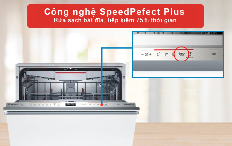 Với tính năng rửa tăng tốc, thời gian rửa sẽ giảm đến 75% rửa thường. Để sử dụng, nhấn nút SpeedPerfect+ trên bảng điều khiển hoặc SpeedPerfect+ trên Home Connect.