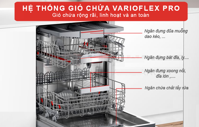 Hệ thống giàn VarioFlex Pro thiết kế 3 tầng rửa riêng biệt. Các đồ dùng nhỏ như bát đĩa, cốc, chén ly vào giàn rửa chính giữa. Còn những vật dụng có kích cỡ lớn như xoong, nồi, chảo, thớt nên xếp vào giỏ dưới cùng.