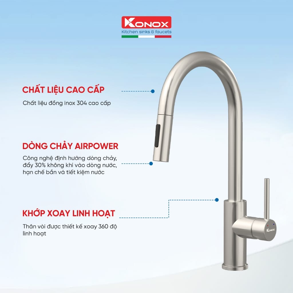 Thân vòi xoay 360 độ: Mang lại phạm vi tiếp cận rộng, thuận tiện khi rửa xoong nồi cỡ lớn hoặc làm sạch bồn rửa.